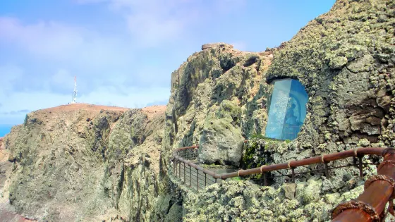 這是一個位於加那利群島蘭薩羅特的觀景台。觀景台由兩個層次組成:第一層是一個室內觀景區,有窗戶,提供令人驚嘆的風景全景。第二層是戶外露台,可以看到更廣闊的景色。