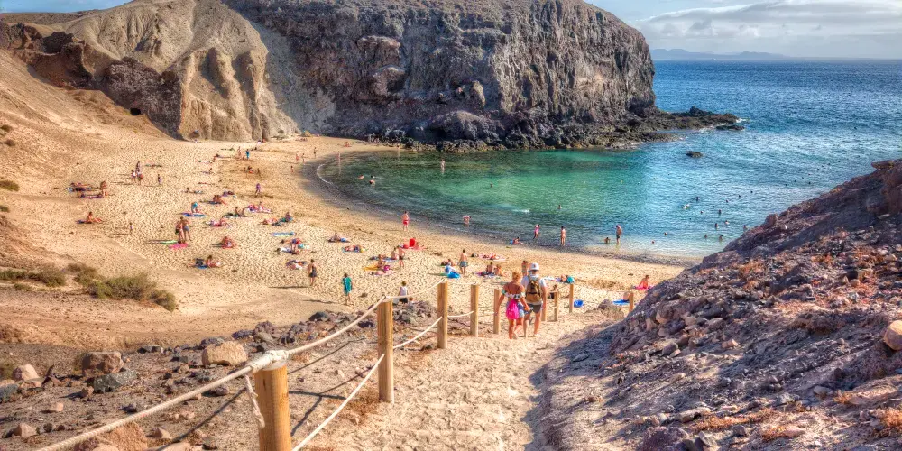 Playa de Papagayo位於西班牙加那利群島蘭薩羅特島南部的雅伊薩地區,是一處以自然美景和寧靜氛圍聞名的海濱景點。這裡屬於洛斯阿哈切斯自然公園(Parque Natural de Los Ajaches)的一部分,環境保存良好,周圍幾乎沒有大型商業開發,保持著較為原始的自然風貌。
