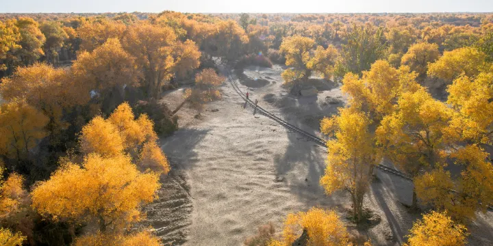 在我國巴音郭楞自治州的內陸河塔里木河,分佈着世界獨一的原始胡楊森林公園保護區,它位於中國新疆維吾爾自治區阿克蘇地區阿克蘇市民主路,全世界胡楊林有百分之十在中國,而中國的胡楊林有百分之九十在新疆塔里木河畔。它的祖先遠在一億三千五百萬年前早就出現了,被地質學家稱為“第三紀活化石”是世界上非常古老的一種楊樹。1993年在國家有關部門重視和支持下,批准在塔里木河畔成立了我國一個沙漠胡楊森林公園。依傍於塔里木河公園,佔地5000餘畝,平坦如境的沙漠石油公路,直通公園內部,公園內設有舞廳、卡拉ok廳、餐飲部、旅館部。旅館部可接待大型旅遊團體。公園大漠天鵝湖內設有遊艇、汽艇,遊客划船至湖中,儘可觀賞大漠天鵝湖奇觀,也可泛舟垂釣,感受一下,“姜太公”釣魚的滋味,如果有興趣登眺望塔,壯觀沙漠油田和晝夜燃燒的沙漠火,定會令您驚歎不已。