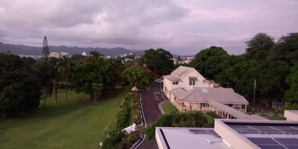 蘇瓦總統府是國家最高首腦的辦公地點,入口看著很簡陋,兩扇很不講究的鐵柵欄門約五米寬,豪爽地敞開著。辦公建築則源自英國殖民時代,它依山傍海,前面就是南太平洋。