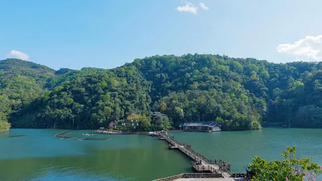 乘坐電瓶觀光車直達湖光山色的定波湖,亭台樓閣點綴其間,藍天碧水相印成趣。