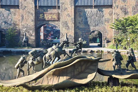 沿着茶馬古城旅遊小鎮正關天街進入景區,首先映入眼簾的是莊嚴聳立的思茅城關,水光瀲灧的飲馬湖上是跋涉在古道之路上的馬幫羣像——“傳茶者”,為我們展現出馬幫在陡峭山道中艱難跋涉的畫面。正是一代代馬幫人憑藉剛毅、勇敢和智慧,用血汗澆灌出一條條通往東西南北的貿易之路,從這裏,開啟探祕之旅。