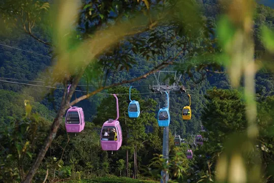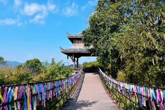 走過繁花掩映的水上浮橋,前往彩虹索道起點,此段索道全長786m,乘坐時間約13分14秒,寓意一生一世的浪漫。乘坐索道過程中,遊客可欣賞風光旖旎的亞熱帶雨林和漫山遍野的生態茶園,遠眺茶城普洱風光,感受清新自然的鄉野風光。