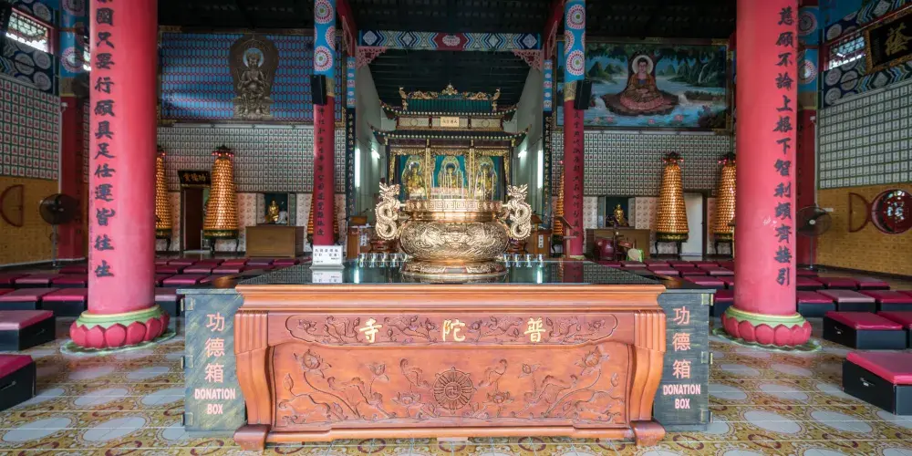 普陀寺位於馬來西亞沙巴島鬥亞蘭路盡頭,建於1980年,是一座由華人出資修建的寺廟,規模較大。普陀寺襲承了中式寺院一貫的建築風格,且寺廟的建材都從中國運來。進入大門,就可以看到巨大的觀音菩薩立像,廟的山門前有白玉石雕塑的仙女,非常精美。寺內建有大雄寶殿,殿內供奉有三尊大佛,威嚴肅立。