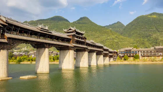 重慶黔江濯水風雨廊橋位於重慶市黔江區濯水鎮。橋上建有層塔亭,橋內擺放有紅漆長凳。橋廊中段,還有木結構二層眺望樓。