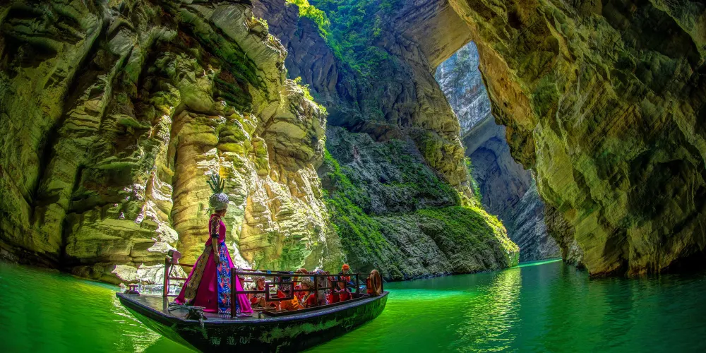 濯水景區-蒲花暗河簡介距城區約20餘公里,距濯水古鎮約2公里。集地下暗河、天生三橋、天窗(天坑)、溶洞、峽谷於一體,景觀迷人,獨具魅力。在這裏可以感受三天兩夜的穿越探索之旅,三天兩夜的穿越,將是一個上萬年的時光穿越,將帶您走向遠古,看到奇妙,還有的是一種意想不到。蒲花暗河是大自然鬼斧神工的傑作,是水和時間的演變歷史,是土家族文化的根。洞中生三橋三座高約200米的天生橋。這三座天生橋一座連一座,使峽谷成了橋峽,山洞成了橋洞。橋與橋之間的空隙形成一個漏斗,在船上望每一座橋之間的漏斗,天就成了“一線天”,又形如腳板。天生三橋橫跨在暗河上,陽光從寬約10米的天生橋洞射下來,使河水泛起道道鱗波,船在橋下行,人在洞中游,別有一番風味。暗河生奇景穿過天生三橋,就進入了地下暗河,暗河長近3公里。行約1公里,一片梯田出現在眼前,有的是巖溶地貌形成的,有的是鐘乳石形成的,梯田交錯有致。走約2公里,前面出現了一道光亮,亮光狀如土家人的砍柴刀,那就是暗河出口。清潭三潮水“三潮水”位於麒麟山麓,靠山的一面是一個高約10米的石壁,壁上藤蔓密佈,其餘三面怪石嶙峋。潭的周圍是成片的麻柳樹,墨綠的潭水,如一面平放的鏡子,倒映着藍天白雲。潭無上游水源,出口處是一條寬約2米,深約1米的小溪,幾經蜿蜒,流入蒲花河,注入阿蓬江。每天凌晨、中午和晚上匪被漲潮三次。萬燕棲暗河進入峽谷,行約100米,便被一壁約200米高的懸崖擋住,懸崖下是高約100米的大洞。這個洞被當地人稱為“黑洞”,又叫暗河,蒲花河水從洞裏流出。棲息在洞裏的巖燕,巢居在洞裏的石孔裏,早上和傍晚出洞去覓食,太陽大了,就在洞裏歇息,晚上就在洞裏過夜。