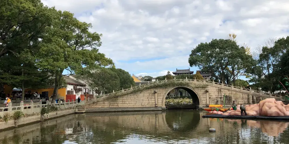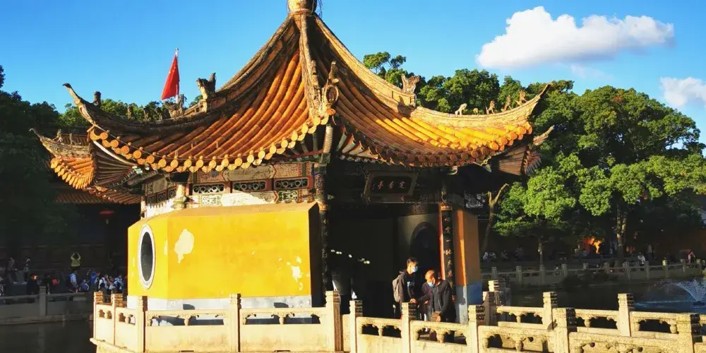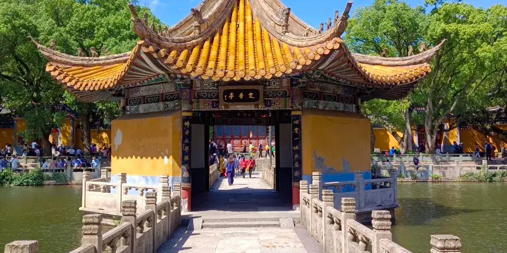 進入寺院會經過一個石牌坊,旁邊有一塊碑刻着“文武官員軍民人等到此下馬”,到了這裏,便開始普濟禪寺的遊覽了。走過石牌坊就是御碑亭,再往前來到海印池。它是禪寺的放生池,池塘中有許多紅色的鯉魚,夏天的時候池塘中荷花開放非常好看。池上有三座橋,橋上有石凳,坐在橋上看風景感覺很棒。池塘東面,白雲古樹之間的永壽拱橋與倒影一直是謀殺菲林的景色。橋前有一面影壁,上面寫着“觀自在菩薩”五個大字,許多遊客在這裏留影。