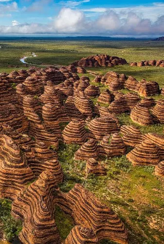 從飛機上看,邦格爾邦格爾山脈交織著橘色和黑色的條紋的蜂窩狀的小山,鑲嵌在矽土和海藻覆蓋的表皮之中,在南部看整個山脈非常清晰。橫掃整個山脈,會看到一個隱藏的山川世界,被風之手不停的雕琢在岩石上。邦格爾邦格爾山脈逢雨季的時候植物和動物資源豐富,這些資源被土著人充分利用,直到80年代中期白人才知道這個地方。因此這裡有很多土著藝術和土葬遺址。