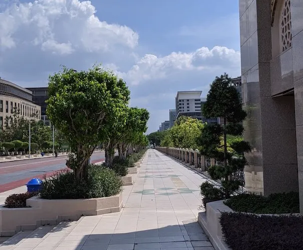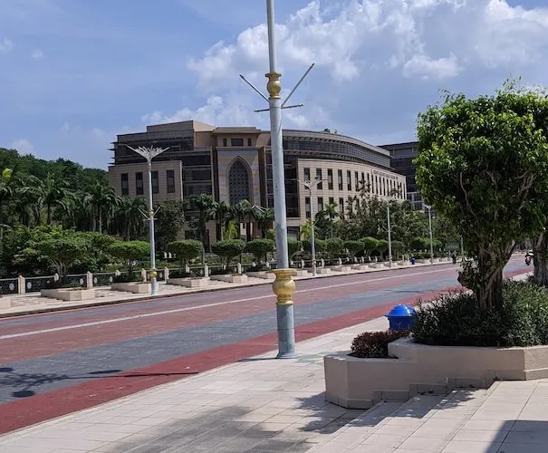太子城廣場的正前方是馬來西亞首相署。這座很有特點的綠色圓頂建築在藍天白雲的映襯下顯得十分莊嚴雄偉。轉身向廣場對面看,是一條寬闊筆直的大道。太子城所有建築物的排列布局,以首相辦公大樓為重心,完全參研了中國建築風水學的精粹,諸如左青龍右白虎,在這裡都有著最恰當的排布,連濕地廣場中心的彎彎繞繞的小水渠及所養的紅鯉魚,都是風水的補充產物。中華民族古典傳統文化、習俗和某些學識,在東南亞地區傳承得更為地道和本色些。
