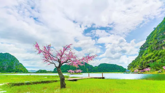 湖區由多個湖泊、溶洞和山峰組成,以「水上田園、洞中天地、湖泊山川」的自然景觀著稱。湖水清澈見底,四周青山環抱,村落點綴其中,風光如畫。