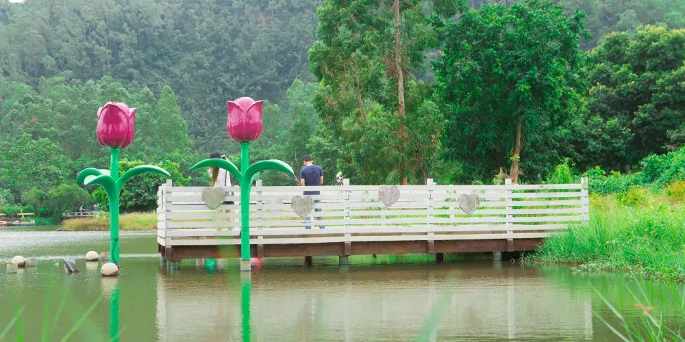 全園分東、西兩大區,東區引軸線連通蒲洲、大角兩山之景點;西區高低起伏,園道迴環曲折,融合東方園林之精華,兩區以湖面自然過渡,渾然一體。