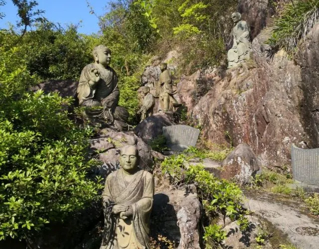 蒲竺寺坐落在福州市長樂市猴嶼鄉浮岐村內。走進蒲竺寺山門,盡覽山中美景,一條蜿蜒的登山石道直通山巔,沿道兩側供奉著數百尊羅漢石雕。羅漢石像之間,還有虎、豹、獅等飛禽走獸的石雕像摻雜其中,登上山巔,站在寺廟前,視野開闊,山下美麗的風景盡收眼底。