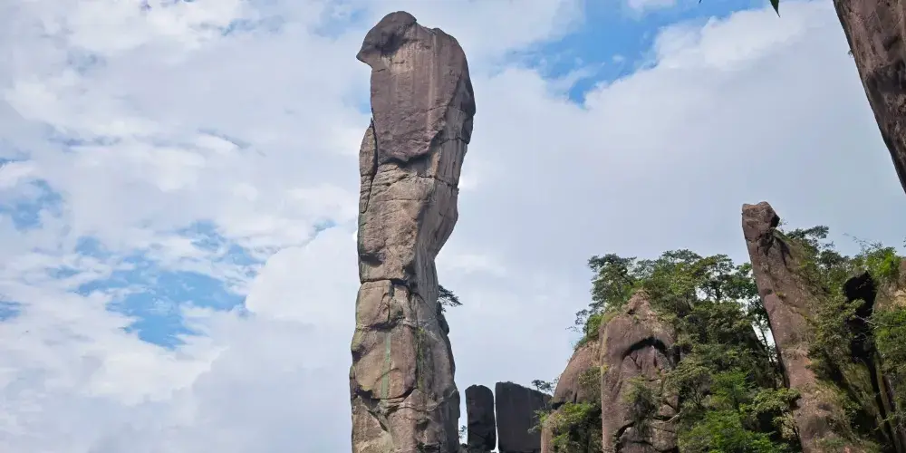 巨蟒出山位於三清山南清園景區內,與東方女神遙遙相望,也是三清山的三大美景之一。它是一根天然的巨型花崗岩石柱,頂部扁平,頸部稍細,形似一條碩大的蟒蛇破山而出,如今經過億萬年的風雨依然屹立不倒,非常神奇。