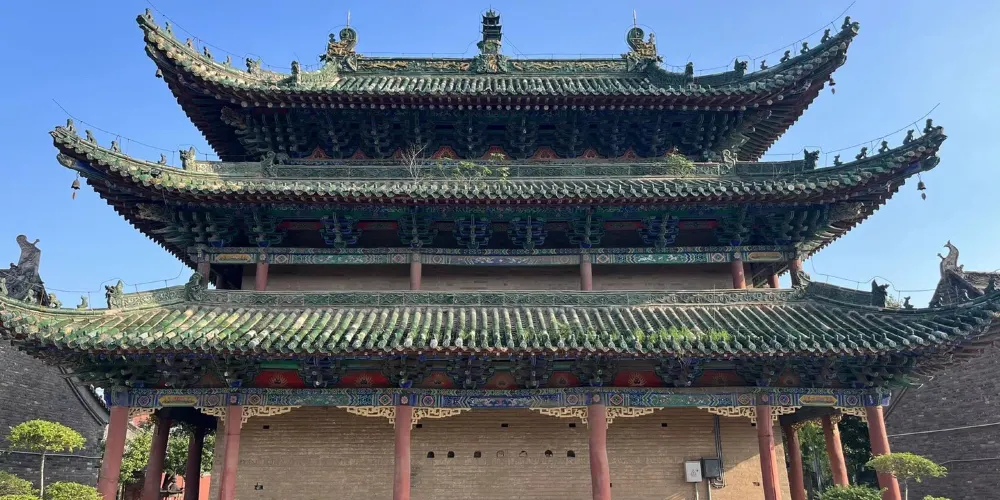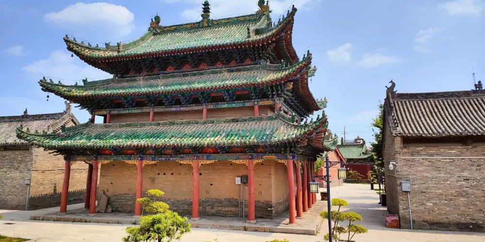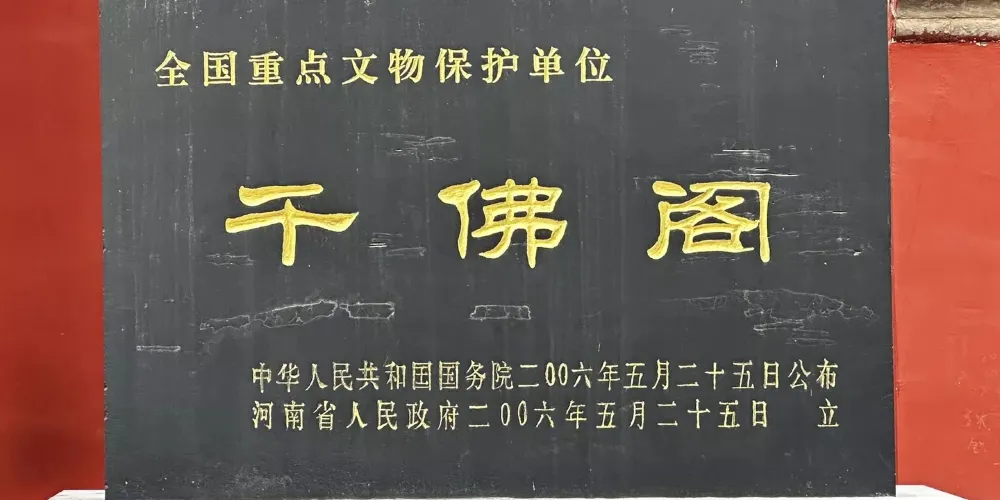 千佛閣位於武陟縣城內南大街北端,建於明嘉靖三十六年(1557年),青鹹豐元年(1856年)重修。三檐歇山頂回廊式建築,麪闊五間,進深五間,東西長17.4米,南北寬15.7米,綠色玻璃瓦覆頂。上層檐下斗拱為七踩三昂,明間補間鋪作兩攢,此間斜拱斜昂拱一攢,側面為土攢,昂嘴刻三浮雲,轉角鬥拱中間昂嘴透雕龍首。大額枋正面有雕花三組。上層閣內頂部巴磚上繪有天干地支、陰陽五行、八卦太極圖等。千佛閣建築高大,氣勢雄偉,雕工精湛,閣頂繪圖反映了明清時期佛道合流的情況。