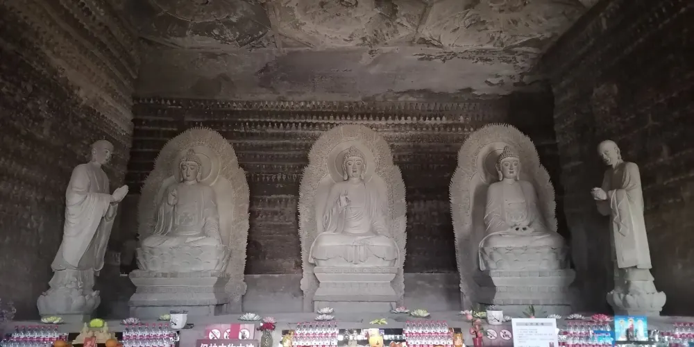 萬安禪院石窟又稱為“萬佛寺”、“石空寺”、“千佛洞”等。石窟開鑿於半山石崖間,平柱上有3處宋朝年間的遊人題記。西南壁間鑿滿大小佛龕、佛像,石山西壁有兩個石窟,窟內的佛像均為四壁三鋪式,一佛居中,兩側侍立二弟子、二菩薩。