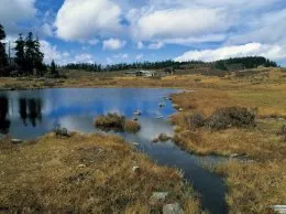 千湖山藏語稱“拉姆冬措”,意為神女千湖或仙女千湖,以三碧海、大黑海為中心,向四周散開。千湖山的湖有的圓若明鏡,有的長似游魚;有的開闊平坦,有的幽深寧靜;有的半環于山窪深處,有的掩映於杜鵑叢中,有的似珠玉成串,有的孤懸於草甸中間;有的怪石露出如鱷魚探頭,有的水色深沉似無底深淵…;…;真是千姿百態。千湖山周圍被原始森林所覆蓋,多為高大筆直的冷杉、雲杉。湖畔長滿了杜鵑林,多是黃杜鵑、紅杜鵑和白杜鵑,花冠碩大,色澤鮮艷。