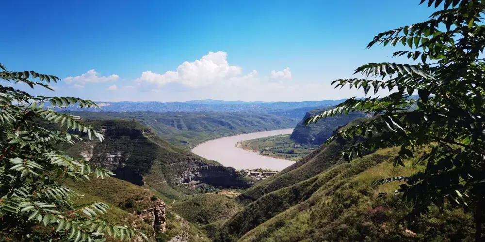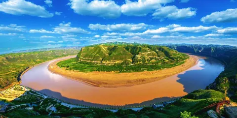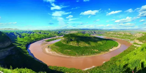 乾坤灣位於延安市延川縣土崗鄉是國家地質公園。登上乾坤灣在乾坤亭內放眼望去,形似太極圖的乾坤灣盡收眼底它形如太極陰陽魚,環抱鬱鬱蔥蔥的青山。山上住著人家,岸邊的草灘上,一群黃牛正在河邊飲水。乾坤灣不僅壯美,還是一幅黃土高原的生活圖畫。