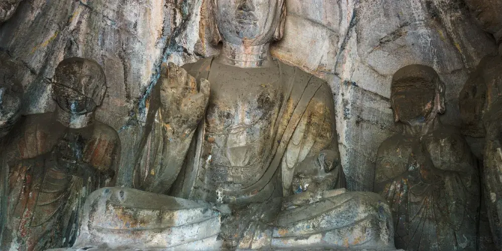 盧舍那大佛是龍門石窟的精華部分,位於西山石窟的奉先寺,是按照武則天的形象塑造的。盧舍那大佛梵語意為光明普照,佛像面部豐滿圓潤,頭頂是波狀形的發紋,彎彎的眉毛下是一雙秀麗眼睛,微微凝視著前方,露出祥和的笑意,大佛整體給人端莊安祥的神態。讓人不經佩服古代的工匠,用手工就能造出巨大又精美的石像。