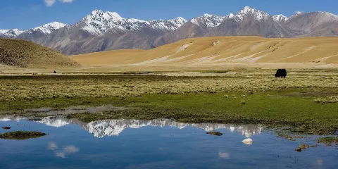 祁連山的平均山脈海拔在4000米-5000米之間,高山積雪形成的碩長而寬闊的冰川地貌奇麗壯觀。海拔高度在4000米以上的地方,稱為雪線,祁連山的雪線之上,常常會出現逆反的生物奇觀。在淺雪的山層之中,有名為雪山草甸植物的蘑菇狀蠶綴,還有珍貴的葯材-高山雪蓮,以及一種生長在風蝕的巖石下的雪山草。因此,雪蓮、蠶綴、雪山草又合稱為祁連山雪網上的“歲寒三友”。祁連山草原,它的代表大馬營草原在焉支山和祁連山之間的盆地中。每年7、8月間,與草原相接的祁連山依舊銀裝素裹,而草原上卻碧波萬頃,馬、牛、羊羣點綴其中。