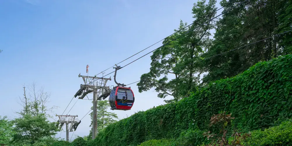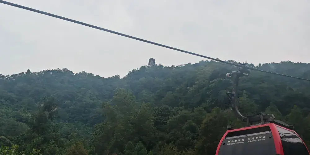青城前山-索道是一條連接山腳與山頂的空中觀光線路。索道全程約2.1公里,乘坐時間約8分鐘。乘客乘坐舒適的四人座纜車,緩緩升空,穿梭於青城山茂密的森林之上。隨著海拔的上升,眼前的景觀逐漸展開,青城山的壯麗山景盡收眼底。在索道行程中,遊客可以俯瞰青城山獨特的地貌特徵。