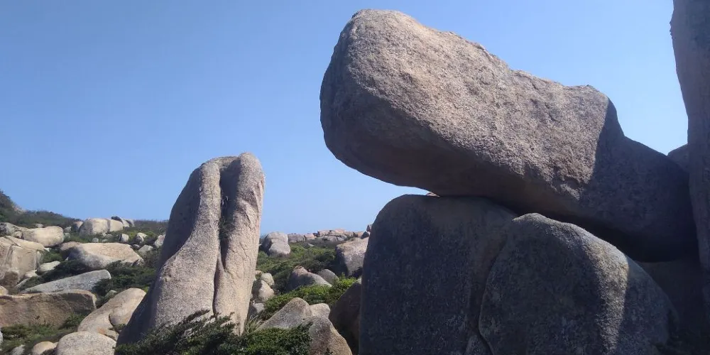 青觀頂石林在海壇島南部的山利村前,由綿羊峰、鱷魚峰、神鵰峰等五個小峰組成。這裡遍布著形態各異的風化花崗岩體,有鴛鴦理翅、綿羊臥崗、蒼鷹雄視等數十處形象的山石景觀。景觀的四周,有許多遺存堡壘、壕溝,它們縱橫交錯,很是壯觀。