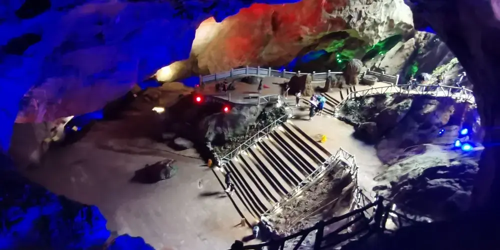 除此以外,懸廊設計團隊充分發揮創意能力,在500米高空的環形懸廊上安裝了音樂燈光水瀑系統,形成了總周長達168米的環形音樂瀑布,不僅在白天給遊客帶來“飛流直下三千尺”的震憾感受,亦能讓遊客觀賞到陽光斜照環形瀑布時形成的空中彩虹,更能在夜幕降臨之際隨着環形音樂瀑布的燈光開啟,2000多衹炫麗燈具的動態表演匯成了精彩的燈光盛宴。夜間懸廊燈光的交相輝映,讓整個景區變成如夢如幻的世界,也帶給遊客帶來極其震撼的視覺享受。