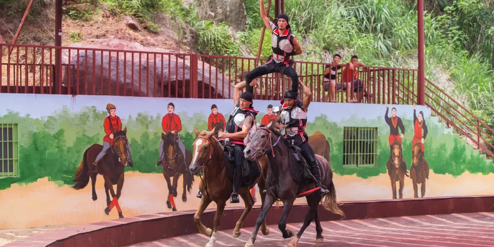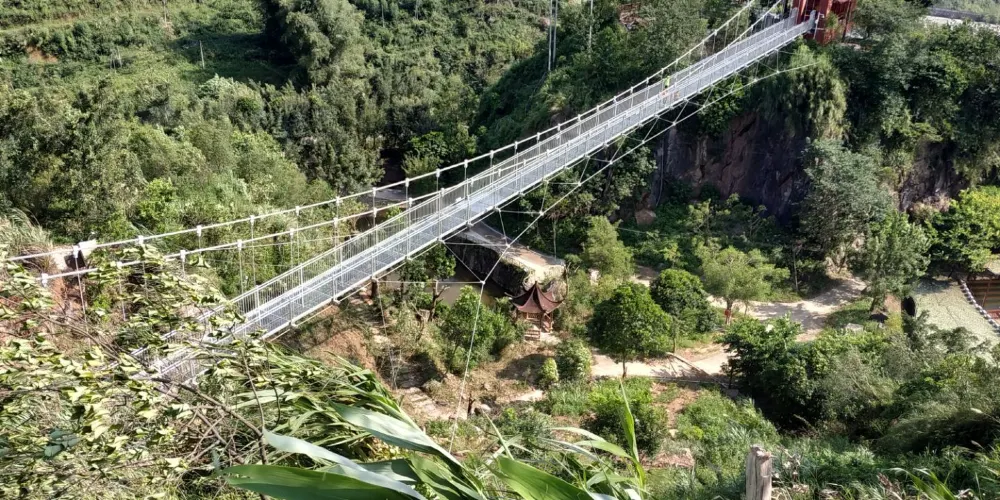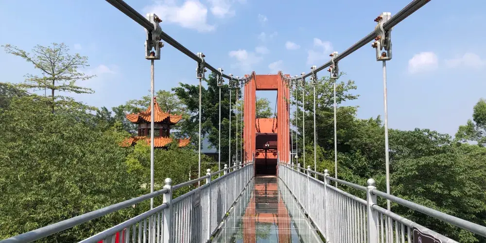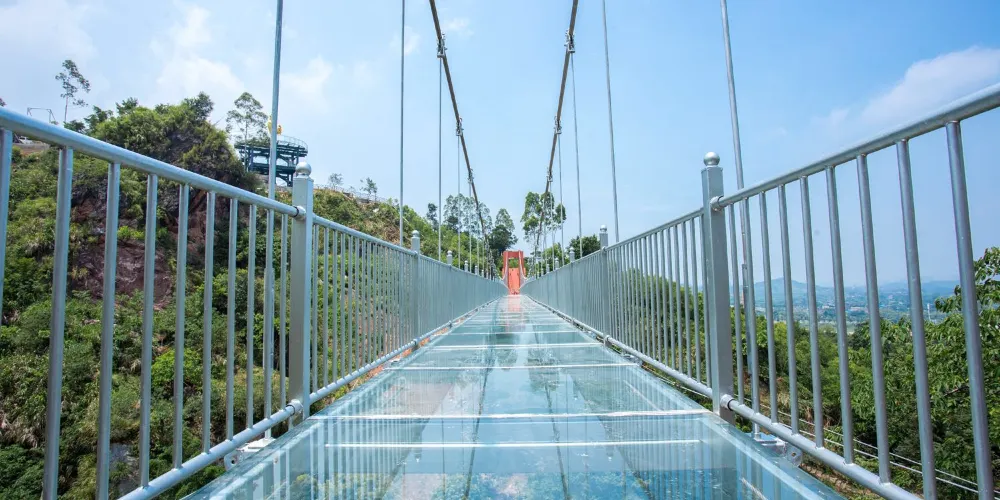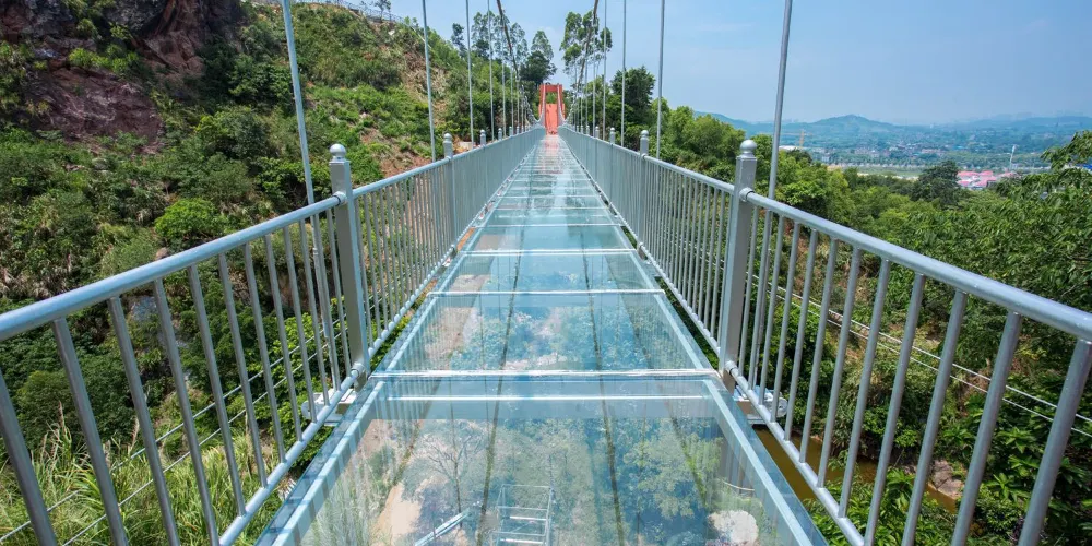 天門懸廊整體由山體伸出直線長度約368米,僅外側單柱懸挑的環形懸廊長度既達168米。旅客前往玻璃廊橋,大部分是為了獲得驚險刺激的高空體驗。懸廊外側處於漂流河道上方,離地垂直高度達500餘米,震憾的高空落差及透明玻璃,帶給遊客無限的驚險體驗,真正達到一步驚心,步步驚心。