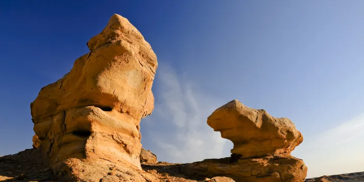 一説到魔鬼城,人們自然會想到克拉瑪依的烏爾禾魔鬼城,它的顯赫聲名是隨着50年代的克拉瑪依石油大開發而名噪全國的。它那鬼斧神工的造型,那光怪陸離的構造,以及令人驚心裂膽的鬼哭神嚎不知迷倒了多少遊客。然而,奇台的魔鬼城無論就其規模,還是就其神韻造型都遠勝於烏爾禾魔鬼城,單就那酷似城堡的程度,就令烏爾禾魔鬼城遜色許多。衹是奇台魔鬼城深藏於大漠戈壁之中,一直不為人知,直到70年代,才被地質工作者發現,從而揭開了它的神祕面紗。魔鬼城內有許多維妙維肖的巖石造型,比如阿拉伯的清真寺,柬埔寨的吳哥窟,西茂的布達拉宮等等。有的還像農婦晚歸、壯士觀天、和尚唸經、八戒睡覺、黃牛耕耘、熊貓打站、鯉魯出水、猴子守山。這些似人似物的造型,全都栩栩如生。魔鬼城並非人力所為,它完全是大自然的手筆。不知多少年前,由於地殼的運動,這裏形成了一些沙巖結構的山體,這些較為鬆軟的巖石在千萬年的剝蝕下,形成了千奇百怪的造型和大小小的洞穴。魔鬼城就是在這種外力作用下形成的。