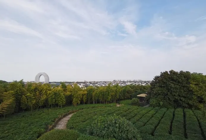 邱城是湖州歷史上較早的城池,始於春秋後期,創建者為吳王夫差的弟弟夫概。邱城的東、南與西南部有新石器時代遺址,故稱“邱城遺址”。如今的邱城遺址經過修葺,已然煥然一新,並建成了一片綠樹成蔭的公園,踩着微微上移的木質步道上,兩邊綠意盎然,空氣清新。登台地之上後,眼前是一片廣袤的茶園,是為唐代的温山御荈茶園。茶園頂為一涼亭,可以在此休憩,西望吳興主峯之弁山,北觀月亮酒店,縱覽小梅口南太湖勝景。