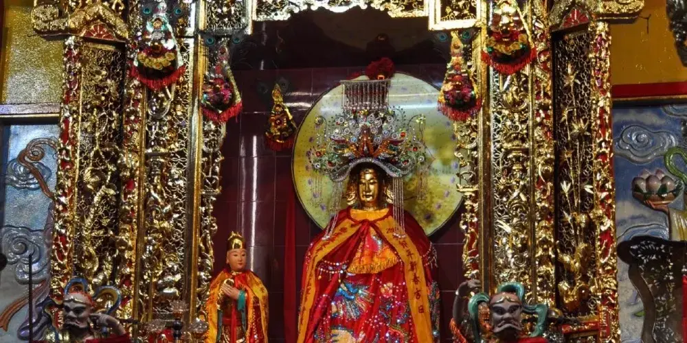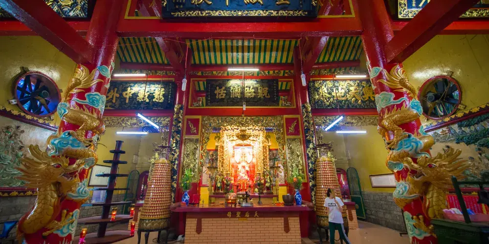 該寺牌匾主要使用漢字。寺廟建立之初供奉的是天后聖母,後來又供奉觀音菩薩,所以後來才改叫觀音廟。屋頂上用瓷磚裝飾著各種神奇的場景,都是來自於中國傳統戲劇和故事的裡情節。寺廟的前門上還裝飾著古老的金漆嵌板。