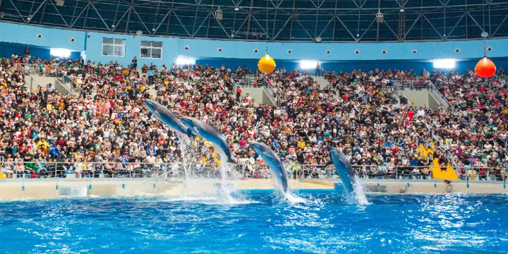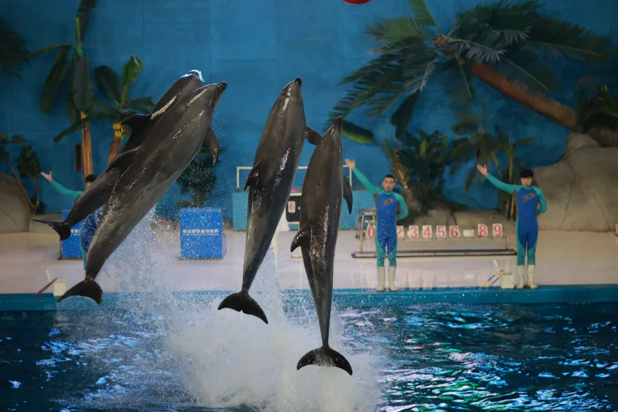 海洋劇場,有幽默滑稽的海獅表演和浪漫刺激的海豚表演,上演八頭海豚同台演出、浪漫騎士、激情衝浪、呼拉圈大賽、尾鰭拍球送大禮、高空頂球、人豚共舞、海獅算數、海獅音樂會等令遊客歡欣雀躍的精彩表演。