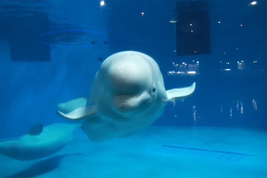 1、迎賓大白鯨:進入館內,先在大廳與有「水中冰美人」之稱的大白鯨互動合影,開啟奇妙海洋之旅~PS:記得在大廳留意當天的節目演出時間表,不要錯過精彩演出。