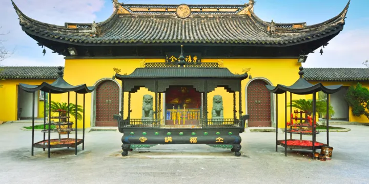 全福講寺位於蘇州市崑山市周莊古鎮南端的南湖岸邊,又叫全福寺,是典型的園林寺廟。寺廟結構嚴謹,分別為山門,指歸閣,大雄寶殿,藏經樓等。景區內有大片湖泊和亭台樓閣,建築大多建在水上,寺門口牌坊上的“水中佛國”四字正是它的寫照。