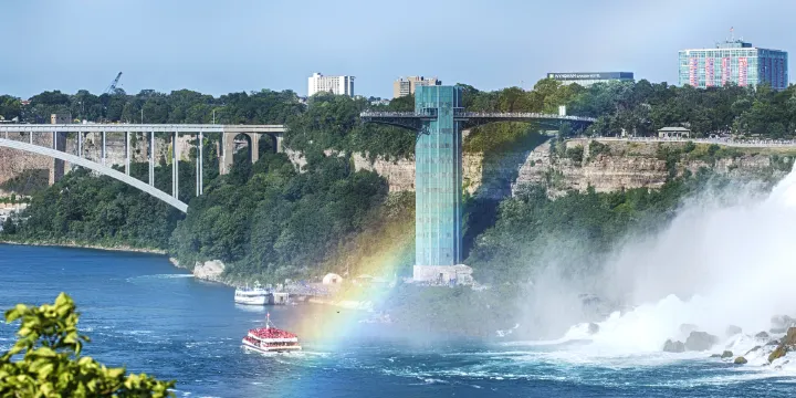 彩虹橋是一座鋼製拱型結構的大橋,橫跨尼亞加拉河,連接加拿大安大略省和美國紐約州的兩座尼亞加拉瀑布城。大橋共有4條行車線和行人通道,可自駕、騎車或步行上橋觀看尼亞加拉三個瀑布的全景。