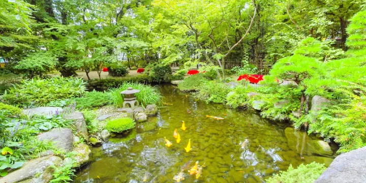 樂水園是被博多特色圍牆圍繞的一片“綠色名勝”。原為博多商人的別莊,後改建為環水式日本庭院。樂水園設有四間茶室,其中2間房間供給給一般的來客。茶室前面有一片廣大的日本庭院,庭院內除了綠意盎然,日本的鮮花也花香四溢。遊客可以選擇在茶室或者在露天庭院內品味抹茶和點心,感受遠離城市喧囂後難得的平靜,體驗當時博多豪商的閒情雅緻。