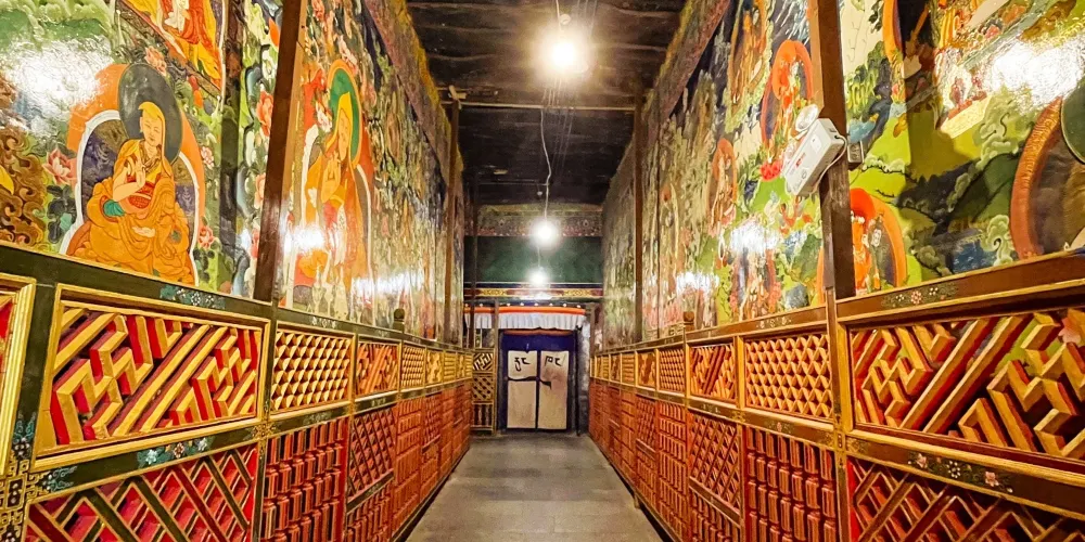 此外,寺內有長近千米的藏式壁畫《文成公主進藏圖》和《大昭寺修建圖》,還有兩幅明代刺綉的護法神唐卡,為難得的藝術珍品。轉經道拉薩有“內、中、外”三條轉經道,都是圍繞着大昭寺為中心而進行。其中,沿寺內千佛殿繞覺康大殿一圈為內轉,稱“囊廓”;沿大昭寺外圍一圈為中轉,稱“八廓”;圍繞布達拉宮、葯王山、小昭寺和大昭寺一圈為外傳,稱“林廓”。景點導覽沿正門進入大昭寺後是一個天井式院落,院子東側有數排酥油燈,因信徒每天都會添加酥油,故常年不滅。酥油燈後面既是大昭寺主殿正門,門口左側為紅教創始人蓮花生大師,右側為強巴佛,即彌勒佛,也稱:未來佛。右側牆上是關於大昭寺建寺故事的壁畫,主要內容是7世紀時期布達拉宮的樣子,以及當年填湖建大昭寺的情景。按照順時針的順序過去是供奉黃教祖師宗喀巴大師及其八大弟子的佛殿。繼續右繞前行,穿過兩邊的夜叉殿和龍王殿,數百盞酥油供燈後面便是著名的"覺康"殿。它既是大昭寺的主體,也是大昭寺的精髓之所在。覺康殿中央為大經堂,是平日裏喇嘛們唸經修行的地方,四周有很多小經堂,其中不可錯過的既是位於正中的釋迦牟尼佛堂,供奉着文成公主帶來的釋迦牟尼十二歲等身金像,這裡是大昭寺的中心,也是前往此地的虔誠朝拜者嚮往的聖地。庭院旁有樓梯通往二樓和三樓,二樓有供奉藏王松贊幹布、文成公主、尺尊公主的法王殿和供奉吉祥天母的班丹拉姆護法神殿。站在二樓寬闊的露台上,可遠眺布達拉宮,是拍照的絕好位置。三樓的金頂也是大昭寺的看點之一,衹不過三樓絕大多數時候不對外開放,萬一機緣巧合可以登上三樓,四座金碧輝煌的金頂讓人歎為觀止。