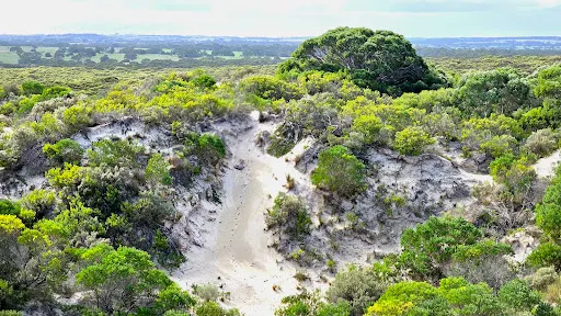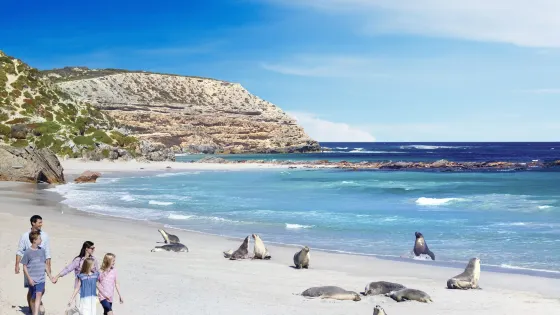 海豹灣以其龐大的稀有動物群——澳洲海獅群而著稱,這是澳大利亞一處遊客可與海豹在沙灘上近距離接觸的地方。1954年,隨著海豹灣水域保護區的成立,島上的海獅群從此可以平安定居,繁衍後代。目前,這裡共有海獅約600頭,它們極通人性,對於遊客們漫步在它們其中,表現得相當大度,當面對遊客的鏡頭時,會擺好姿勢,非常合作地為遊客呈現一副生動的圖畫。
