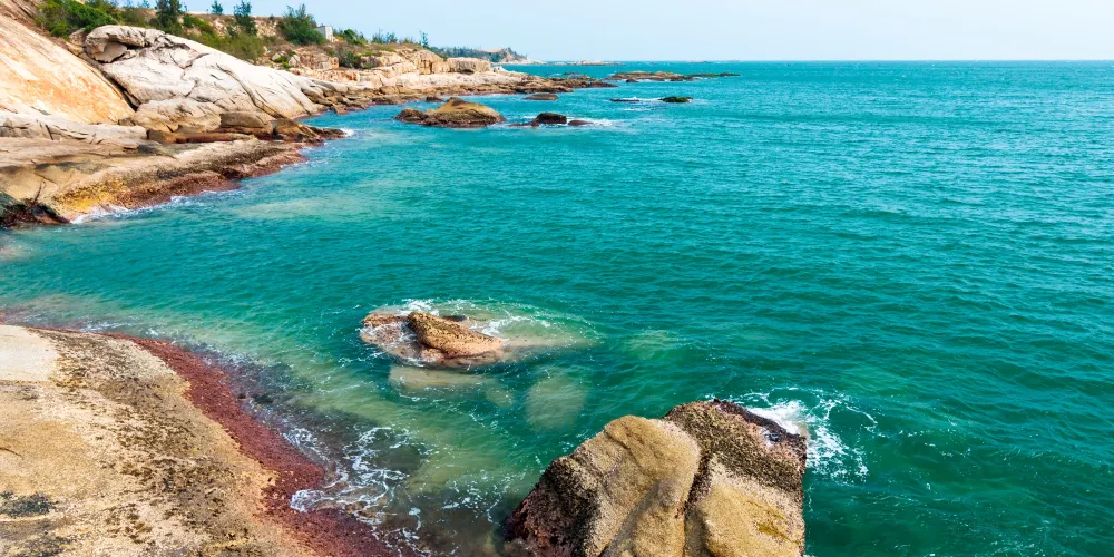 紅海灣旅遊區湖泊、島嶼、港灣交錯,沙灘蜿蜒連綿,沿岸礁岩多姿,濱海風光秀麗,人文古蹟眾多,具有獨特的亞熱帶海濱風光,成為每年海邊休閒遊的大熱之地。紅海灣,顧名思義,當然有紅色的泥土,有藍藍的海水。走上沙灘,沙質細軟輕柔,勻淨得好像是經大自然的神手精心篩選過似的。再走近些,純淨而透明的海水一卷一卷地漫上沙灘,雪白浪花緊隨著潮頭,奔湧而來,又化成飛沫。