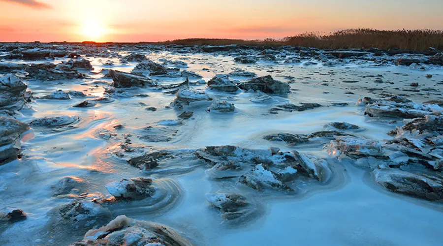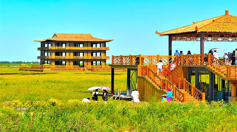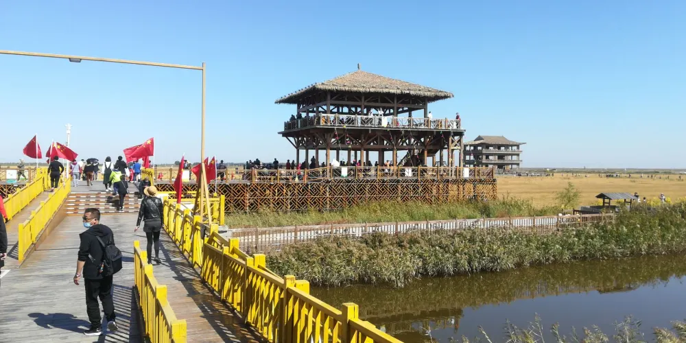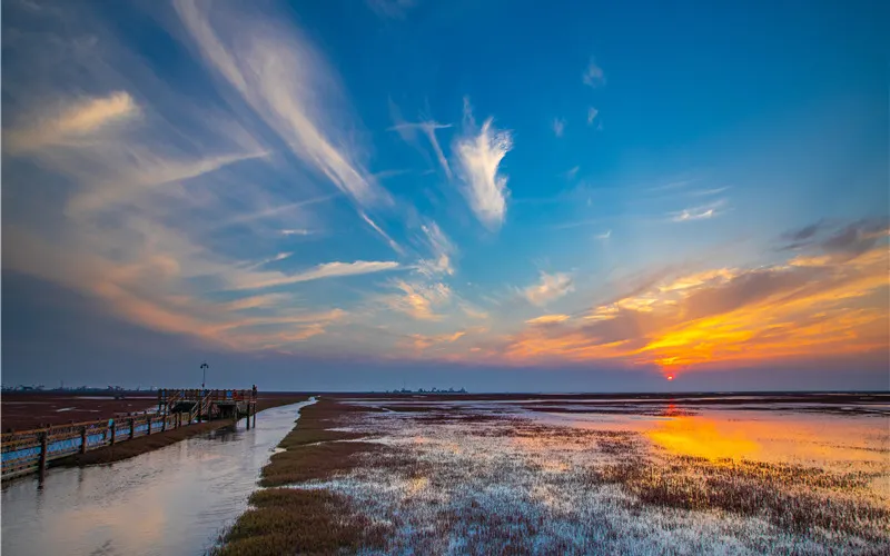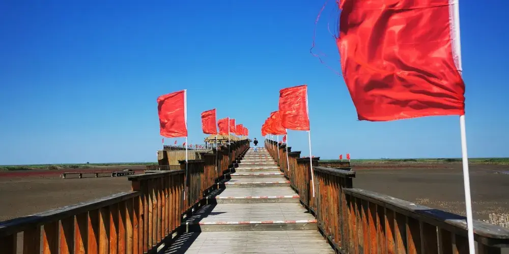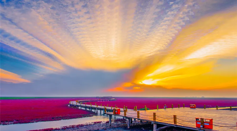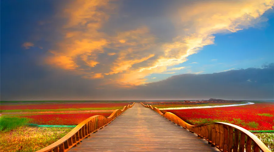 紅海灘國家風景廊道位於盤錦市西南海濱,紅海灘是由大片紅色的鹼蓬草形成的濕地。紅海灘國家風景廊道是紅海灘中面積較大的景區,走在木棧道中,看著鹼蓬草在海岸線上延伸,在夕陽下更是一副迷人的畫卷。秋天還能看到金黃色的稻田和紅海灘相呼應,以及成群的候鳥展翅空中。