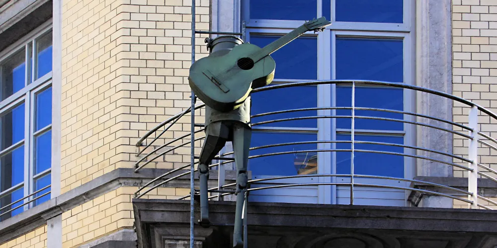 Romeo - Sculpture of a man with a guitar on his back climbing on a ladder