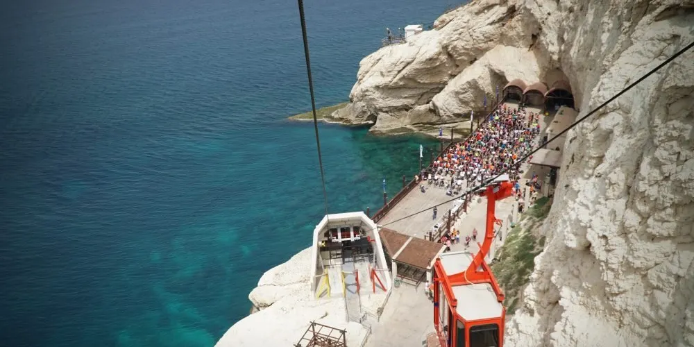 Rosh HaNikra Grottoes位於以色列西加利利地區,緊鄰以色列與黎巴嫩邊界的地中海海岸,是自然地質奇觀與旅遊熱點。 這片白色的石灰岩懸崖因海浪長期侵蝕以及地下裂隙中雨水的溶蝕作用,逐漸形成了一系列壯觀的海蝕洞穴和隧道,全長約200米,洞道蜿蜒、分支,有的可以從內部互通。 為了讓遊客便利地參觀,景區1970年代建造了纜車,從懸崖頂端垂直下降至洞穴入口,是陡斜的纜車線。參觀Rosh HaNikra Grottoes通常包含以下內容:乘坐纜車上下;穿行於洞穴間的步道;在懸崖邊的觀景平台眺望地中海;觀看音影燈光秀,以及了解洞穴形成的地質與生物故事。