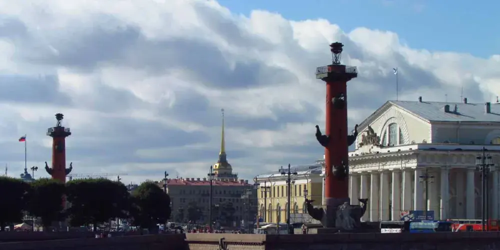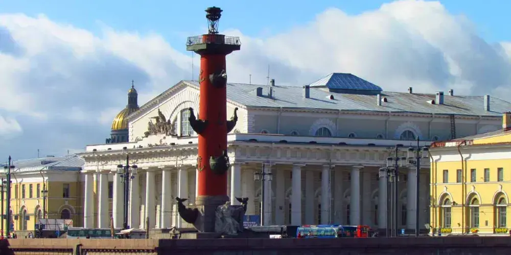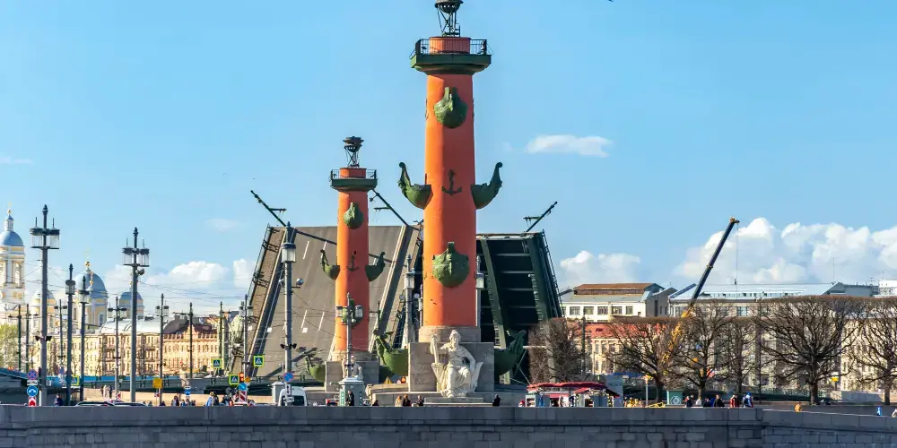 瓦西裡島古港口有兩座燈塔,紅色的海神柱,又被叫做“吻柱”,它曾是航海的燈塔。在一些特殊的節日裡,例如勝利日等,這裡會點燃火炬。而每年5月至10月之間,涅瓦河對面的流動音樂噴泉水柱會噴上天空,高度高達60米。