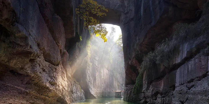 來到這裏,我們主要是參觀明太祖朱元璋的一項重要建設---天生橋和胭脂河。胭脂河和天生橋修建於3百多年前,當時朱元璋為了讓江浙的糧草順利運往金陵,便開鑿了這人工內河。但是,我們要明白那個時候的爆破技術可是不發達的,如何炸石鑿河就非常考驗古人的經驗和智慧,一河一橋的建成可謂來之不易啊。焚燒技術讓石頭變得鐵銹紅色,“胭脂”二字由此而來,多餘的大石塊索性利用作為峭壁間的橋樑,取名“天生橋”。