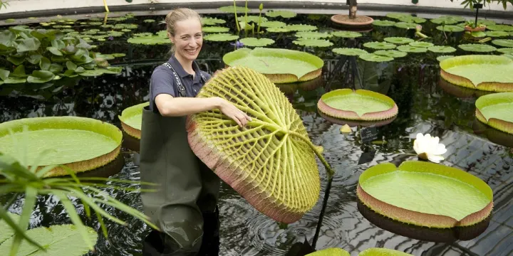 △ 睡蓮屋(Waterlily House,冬季閉園)中的巨型亞馬遜睡蓮,葉寬達3米