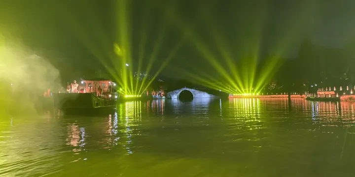 演出採用全新“行進+沉浸”式觀演模式,並將戲劇、電影、水幕、光影、裝置等藝術巧妙地融於一體,帶來真人實景與水幕光影相結合的視覺盛宴,讓觀者感受“人在船中坐,船在畫中游”的別樣體驗。
