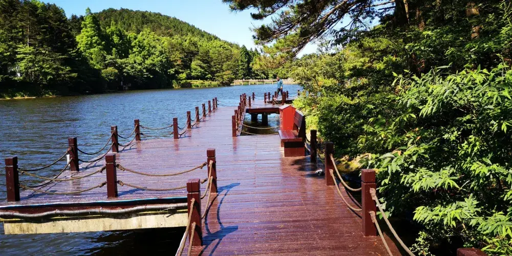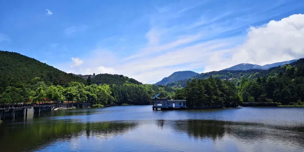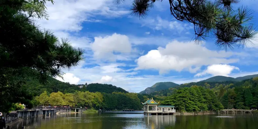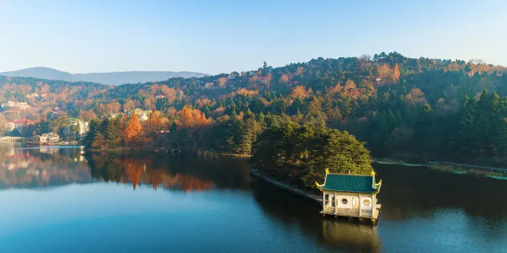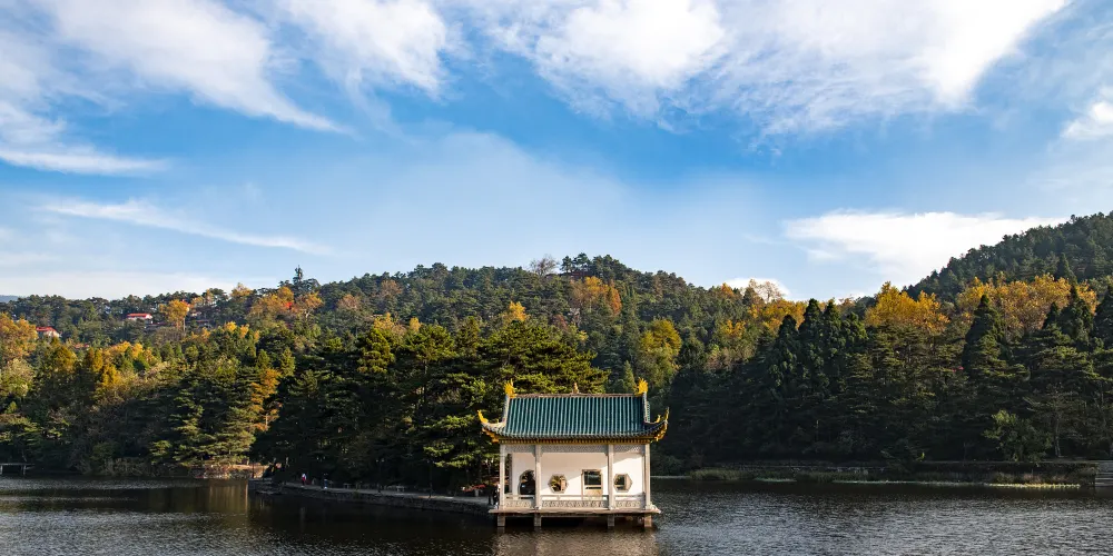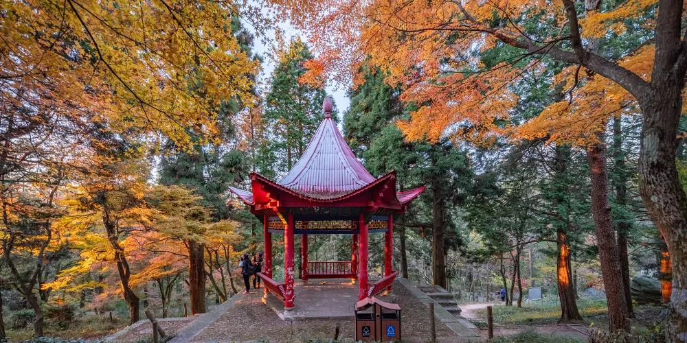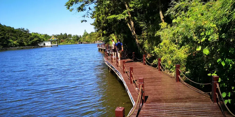 沿著大林路步行至廬山花徑,順路可見冰川遺跡-冰桌巨石,又叫飛來石。廬山花徑相傳是唐代詩人白居易詠詩《大林寺桃花》的地方。傳說,白居易被貶任江州(九江)司馬時,曾來廬山遊覽,當時正值暮春,白居易有感於山下桃花已落而此處桃花仍盛開,故人們也稱此地為“白司馬花徑”,並建造了“景白亭”。