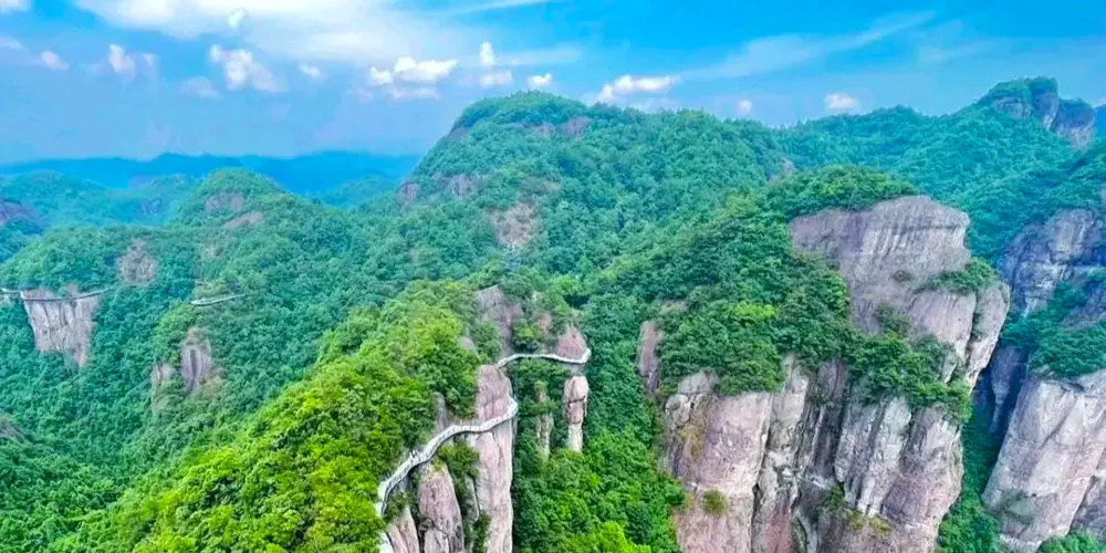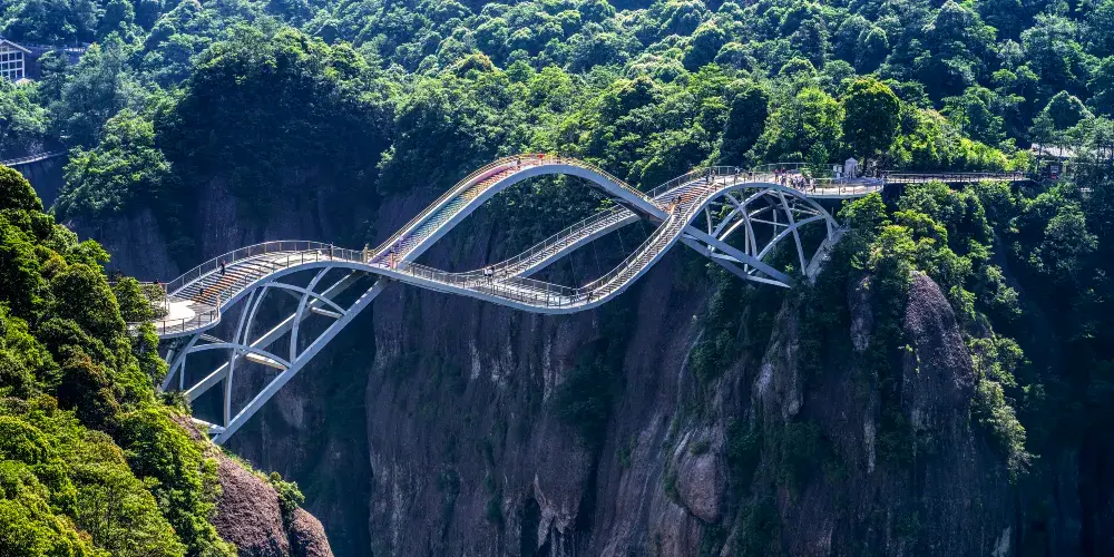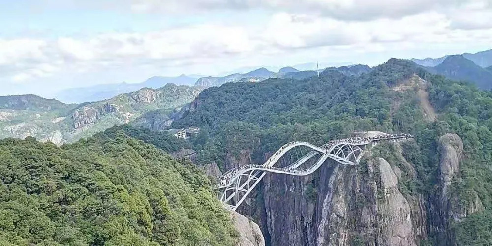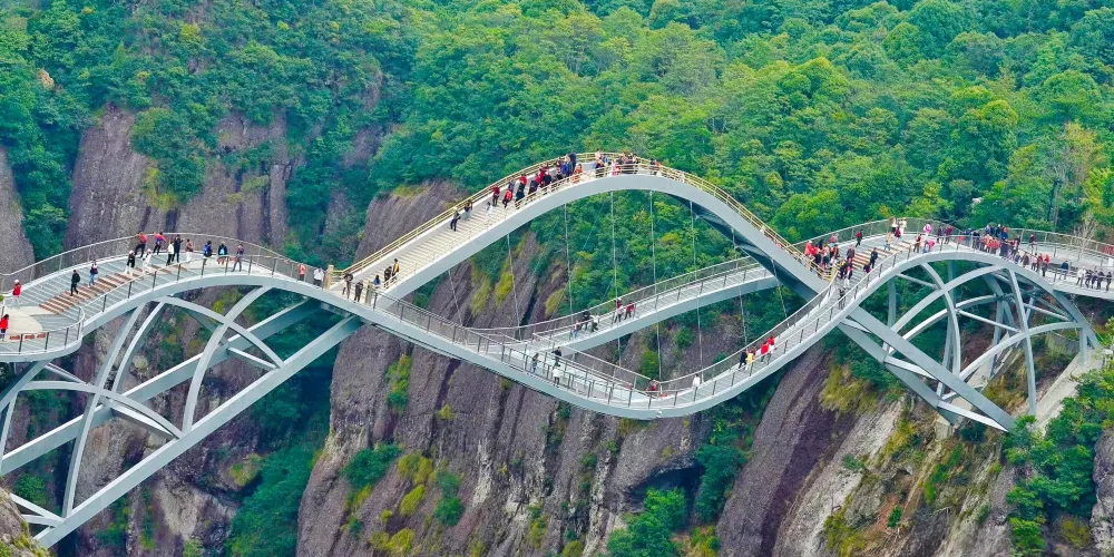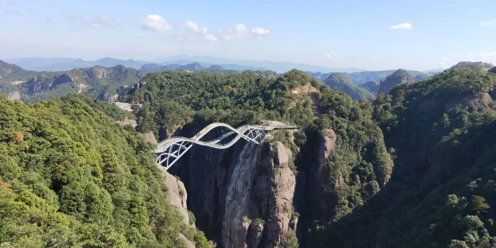 神仙居景區-如意橋是一座現代設計與自然景觀融合的橋樑,位於仙居國家公園內。剛柔並濟的造型與神仙居的自然風光融為一體,其造型猶如一柄如意橫掛在了兩山之間,又似仙女的披帛。橋樑設計靈感源自中國傳統的如意造型,象徵吉祥和美麗。其獨特的曲線結構與周圍的青山綠水相映成趣,成為仙居的一大亮點。