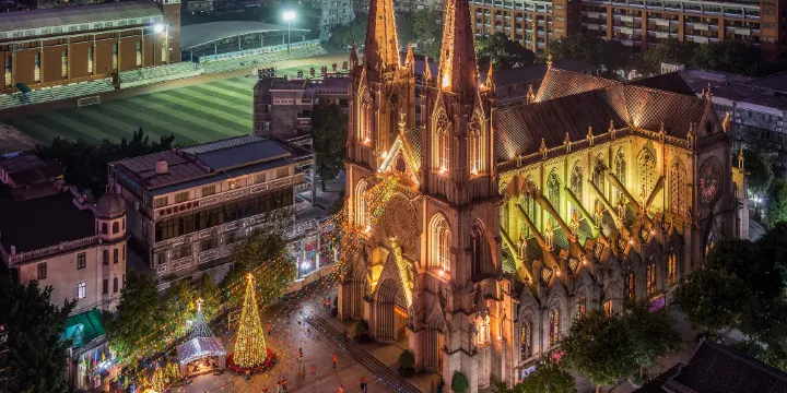石室聖心大教堂是廣州的教堂,現在已經成為廣州異域風情的經典代表。教堂正面有一對巍峨高聳的雙尖石塔,石塔中間有四具從法國運來的大銅鐘。