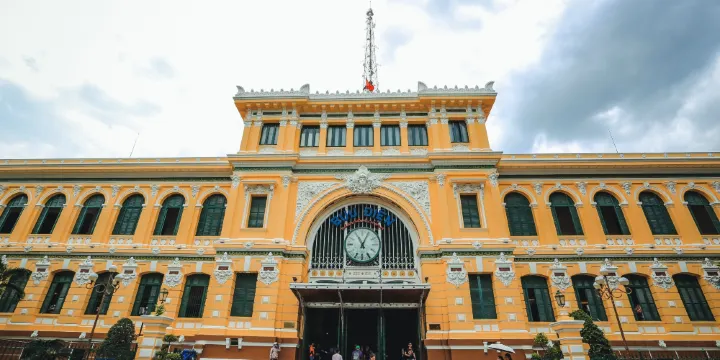 中央郵局是胡志明市法國殖民時期的一座郵政局,建於19世紀末。外觀看上去像是一個車站,每一處都有精心設計與裝飾,正面時鐘下面寫著郵局建設的時間(1886-1891)。走進郵局內部,大廳十分寬敞,有著古典拱門形狀的天花板、圓形花窗、大吊燈、花形壁燈等華麗裝飾,舊地圖下設有特色電話亭,可以撥打國際長途電話。可以在中央郵局郵寄一張明信片。