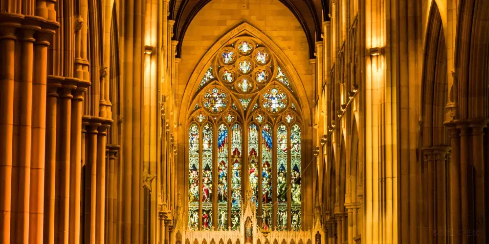 進入教堂內部,看見巨大的圓柱支撐著巨型拱頂,宛若蒼穹,高聳深邃,瀰漫著神聖的氣息。放眼望去,大型莊重的管風琴、巨大的彩色玻璃畫,陽光透過彩色玻璃靜靜地散落在椅子上,這一切都是如此平靜。教堂非常值得一看的地方是那些彩繪玻璃,每個窗戶都是一個聖經故事,人物場景都描繪的生動傳神。